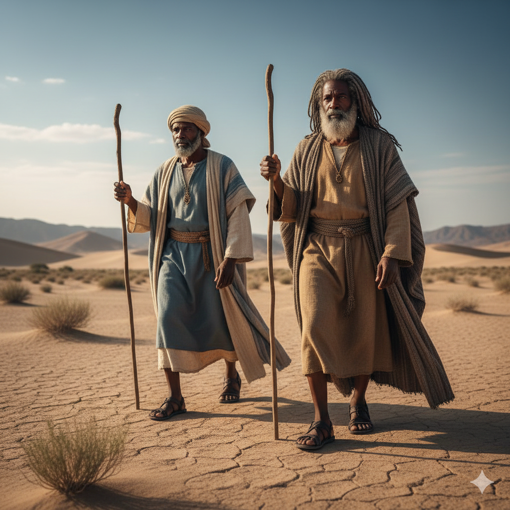 Image of two ancient travelers walking miles in sandals.